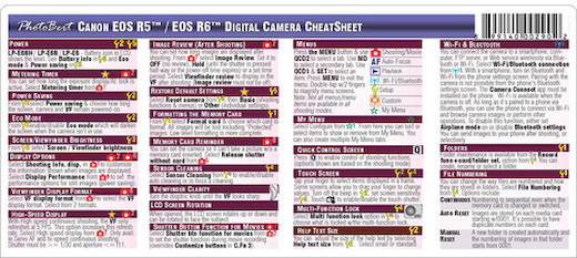 This used PhotoBert CheatSheet is an abbreviated, easy-to-read, color-coded guide to the controls and settings of the Canon EOS R5 / R6 Digital Mirrorless Cameras.