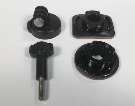 The kit includes a curved adhesive mount, a flat adhesive mount, a quick release base, a pivot arm, three locking screws, and a 1/4"-20 screw adapter.