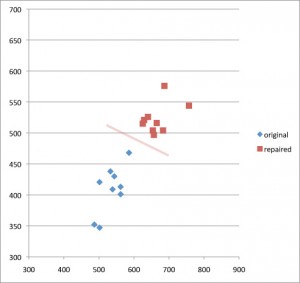 Nine lenses pre and post repair, with the SQF suggested line of acceptability