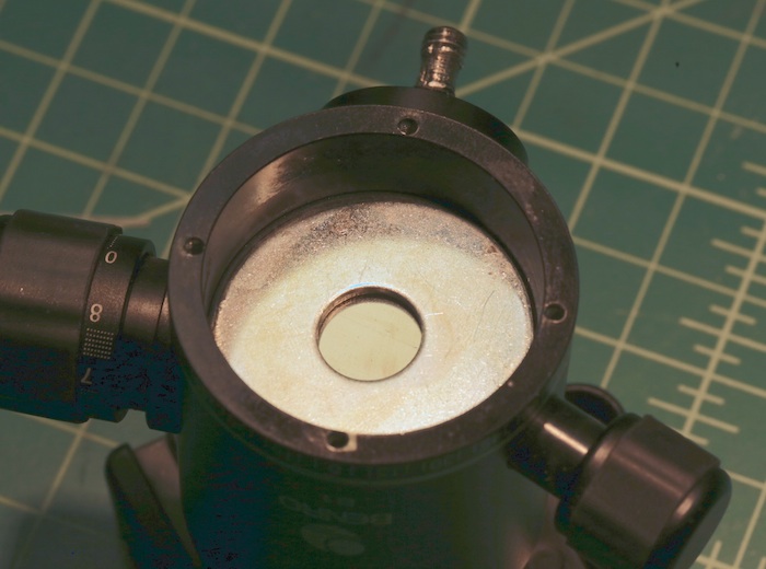 Of course, the ballhead needs a very sturdy base under the conical plate, so that the pressure from the adjustment knobs all goes up to the friction plate and ball. In this case there’s a 1mm thick steel plate with a 1mm thick steel washer beneath that, held in place with an equally thick e-clip. The remaining space is taken up by the rotating (panning) base plate, which is attached by 4 screws (you can see the screw holes in the bottom of the case).