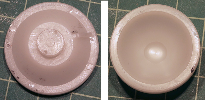 - Internal and external views of the plastic bearing cup that fits over the ball.