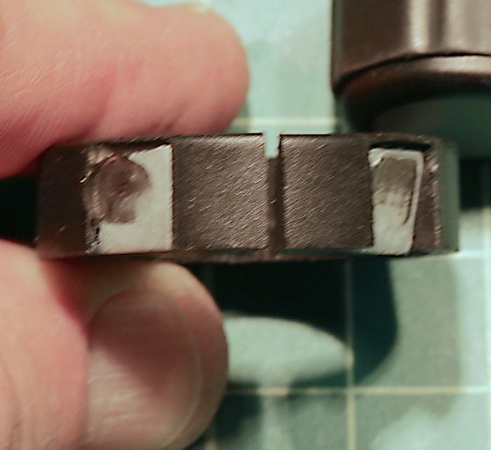 - Side view of the compression ring showing the two plates where the locking and friction knob rods make contact. Despite the blur (it’s not camera shake, it’s 4 cups of coffee hand shake) you can tell one is flat, the other tilted about 30 degrees. You can also see some wear in this two-year old ring where the rods make contact.