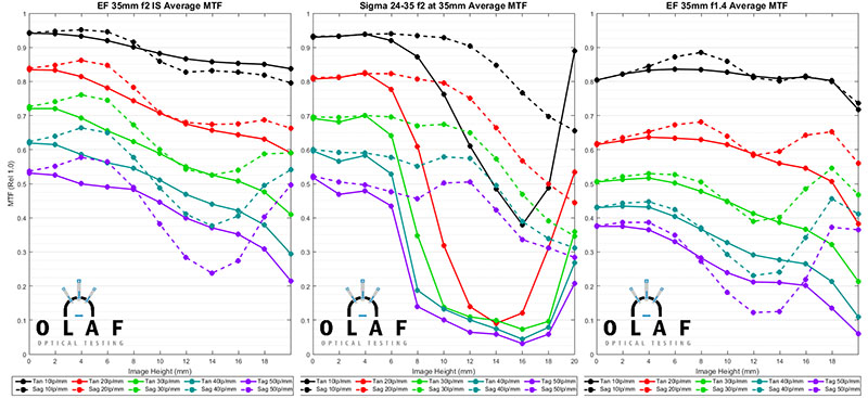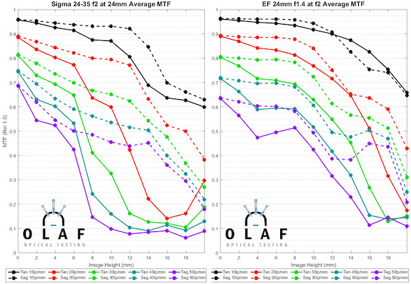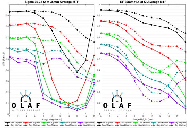 As at the other focal lengths, the Sigma is superb in the center, but has more astigmatism away from center. We can also directly compare the Sigma with the 35mm f/1.4 tested at f/2.0 to even up the apertures.