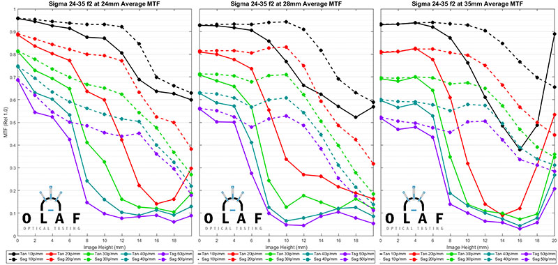I generally do MTF testing on multiple copies of a given lens so that I can present the averages, look at sample variation, and stuff like that. I’m always aware that looking at any single copy of a lens, especially a zoom lens, gives only a limited prediction of how other copies might look. But sometimes a limited prediction is still pretty exciting. As luck would have it, I was able to get a single copy of the Sigma 24-35mm f/2.0 DG HSM Art lens for testing today. It will be a week before we have enough copies to begin doing out multiple copy tests, so I thought I’d go ahead and post the results of the one copy.