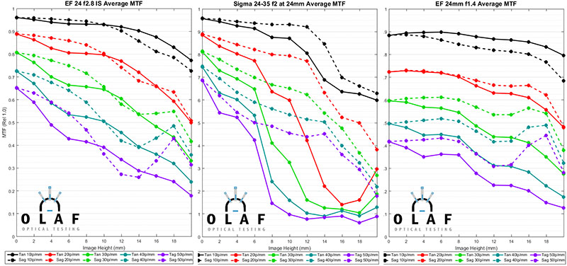 The Sigma zoom is pretty impressive, particularly in the center where it actually has better resolution than the Canon 24mm f/2.8 IS lens, despite the Sigma’s stop wider aperture. It’s clearly better than the Canon 24mm f/1.4, but of course the Canon is being tested a full stop wider than the Sigma zoom. Off axis, though, the Sigma doesn’t do quite so well, with a lot of astigmatism in the outer 2/3 of the field. Towards the edges both of the Canon primes are doing better than the Sigma. But still, that’s pretty impressive for a zoom. Primes are expected to be better in the outer 1/3 of the field.