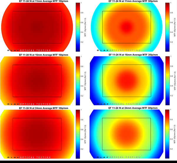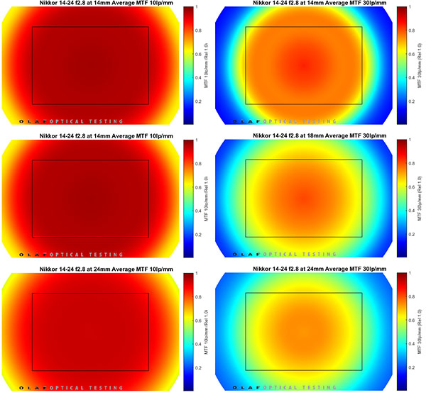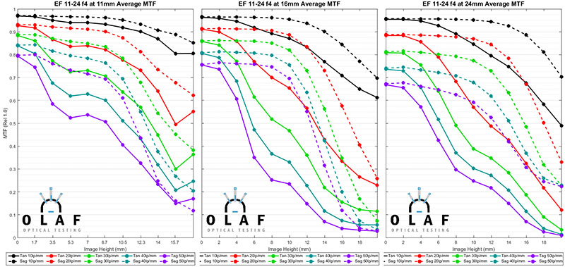 OK, let’s compare a couple of the even wider zooms: the Nikon 14-24mm f/2.8 and the Canon 11-24mm f/4. The Nikon is the gold standard for a wide-angle, wide-aperture f/2.8 zoom. The Canon has broken new ground for just how wide you can go with a zoom. I do want to point out that due to limitations of our optical bench we can’t completely measure the Canon lens at 11mm from edge to edge. Instead of 20mm off axis (nearly to the corner) we can only measure to 17.5mm off axis. So the ‘corners’ on the graph below at 11mm look better than they really are because it’s not measuring as far to the corners as the other lenses.