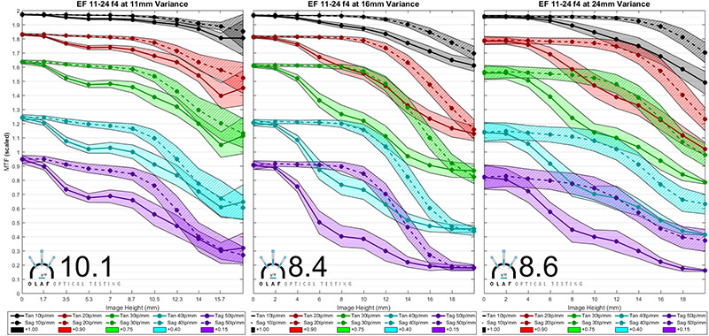 The Canon 11-24 f/4 though was just shockingly good. We did not expect anything like those numbers. It’s by far the most consistent zoom we’ve tested; far better than many prime lenses. I have no idea what Canon is doing or how they are doing it, but the copy-to-copy variation in most of their new lenses is minimal. I know people love to think that better inspection or QA procedures would accomplish this, but that’s not really the case. A lot of it has to do with designing the lens so that tolerances are not so critical. Put another way, that means that a tiny movement of an element doesn’t cause a huge change in the optics.