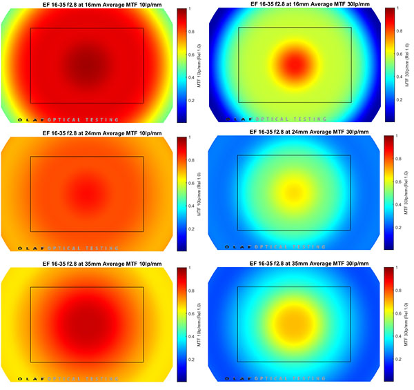 The optical bench confirms a couple of things that most of us already knew. For example, the 16-35mm f/2.8 is weakest in the middle of its zoom range. At the 16mm end, it’s at it’s best in the center, but gets pretty weak in the corners. At 35mm it’s not nearly as good in the center as it was at 16mm, but it holds up better in the corners. There’s no question, though, that if you have a 24-70 f/2.8 lens in your bag you’ll want to take it out for all your 24mm and longer shots.