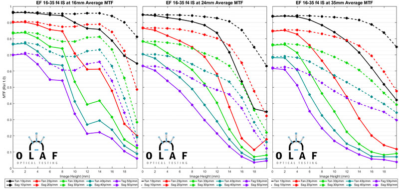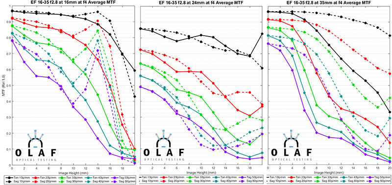 Stopped down to f/4, the 16-35 f/2.8 L dramatically improves in the center at both ends of the zoom range. It’s now about as good as the 16-35 f/4 IS at both 16mm and 35mm, although it is a bit different. At 24mm, though, it’s still not nearly as good as the IS lens. (BTW – those of you who notice the astigmatism jump at 16mm off axis when stopped down — this is a real change and not an artifact. This lens has some higher order aberrations that don’t improve much with the aperture reduced. Basically the sagittal plane gets much better and the tangential plane doesn’t.)