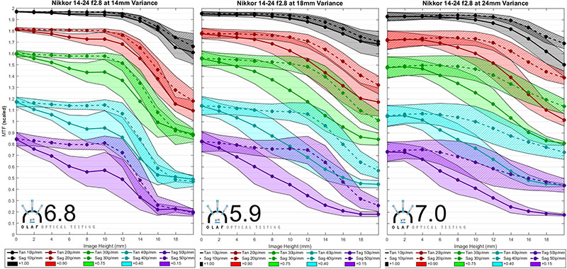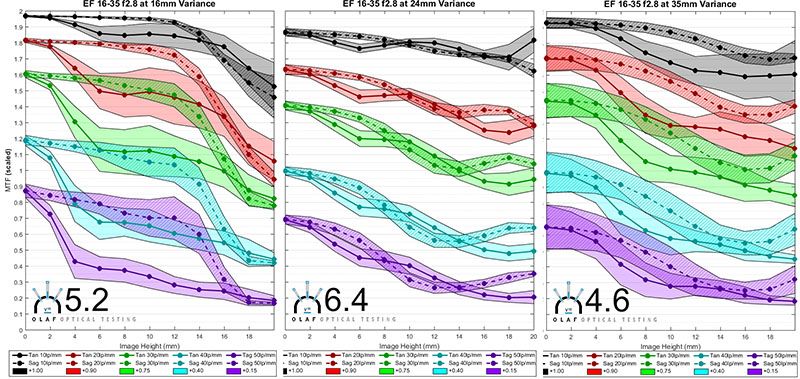 As we’ve seen, zooms have more variation than primes and wide-angle primes have more variation than standard range primes. Also, the MTF curves of wide-angle primes are weaker off-axis than standard range primes. So my expectations for wide-angle zooms were pretty low. I expected to see a lot of copy-to-copy variation and some pretty weak MTF curves away from the center. As with most zooms, I expected the wide-angle zooms would be distinctly better at one end than the other.