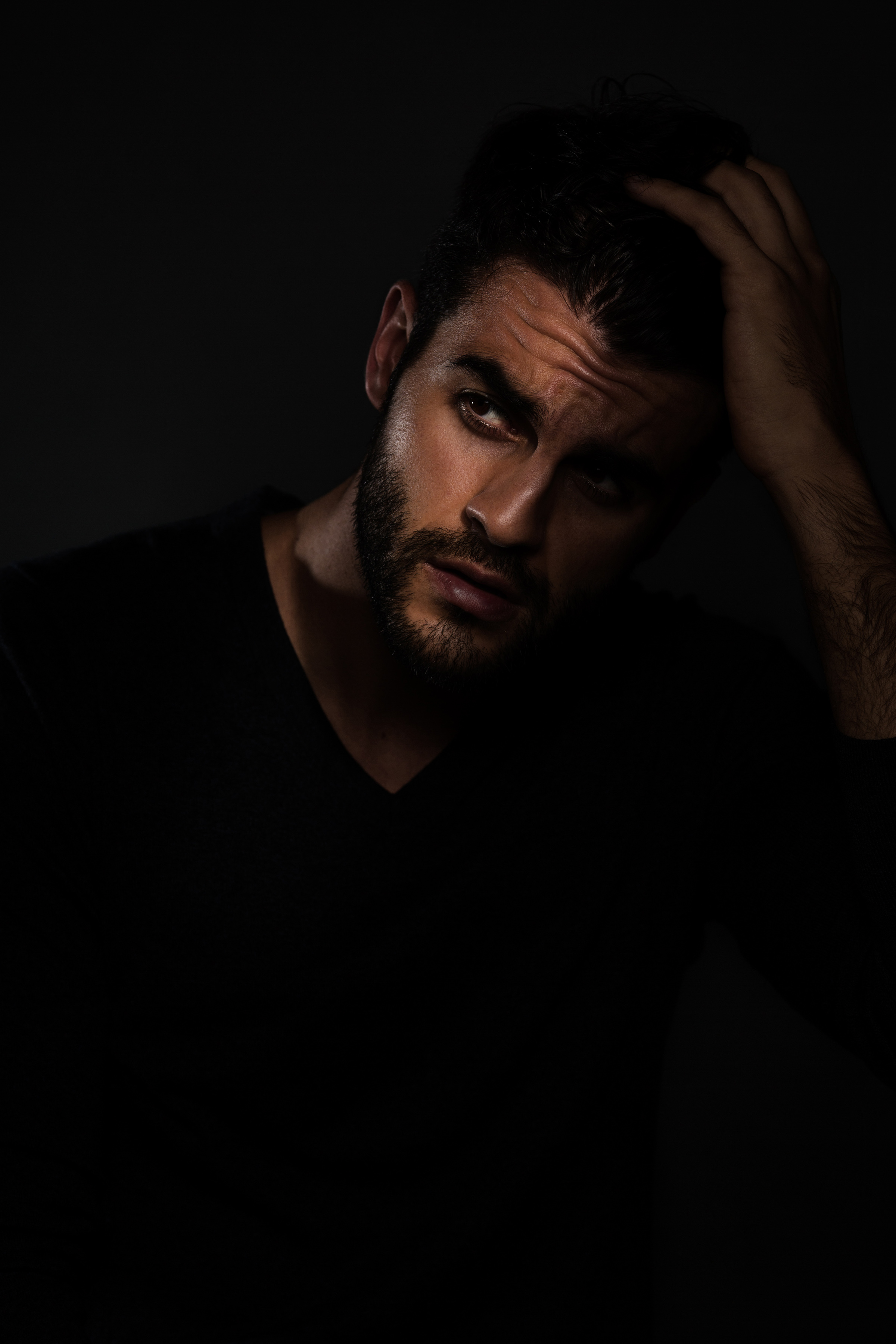 The final look I wanted to discuss is a dramatic lighting look. As I mentioned in the article from last week, I will often use flags and Vflats as a way to cut light. Pair that with grids, and you’re able to get a lot of control over lights while maintaining a softer light quality. I did just that in this photo. The goal of this look was to give a dramatic look that might look like a screen capture of a tense scene in an action movie. To create it, I used a projector lens with a gobo in it to get the slit of light. For rim light, I used a medium softbox with a grid on it to bring focus to his jawline, and then used a gridded octobox to add some fill to the image, but used a black flag to cut the light a bit. The end results are something I am extremely happy with, and the lighting diagram is below.