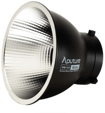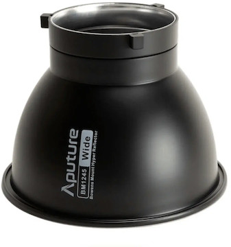 This is the Aputure BM1245 Wide Hyper Reflector. It is part of the Aputure Hyper Reflector Kit. They provide a natural falloff similar to how traditional lighting fixtures do, and they increase the brightness of the large-chip lights.