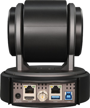 Inputs & Outputs. The camera uses an RJ45 ethernet port for NDI, but also features simultaneous video output via SDI. The camera also features 3.5mm stereo audio input and output and RCA video out if needed. For additional ouput capability, including HDMI, we carry the BirdDog P110 NDI PTZ Camera.