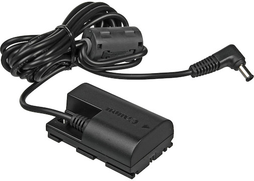 This used Canon DR-E6C DC Coupler for EOS R5 C is compatible with select Canon digital cameras. It fits inside the camera’s battery compartment and has an attached 7.5-foot DC cord, which plugs into the AC-E6 AC adapter accessory.