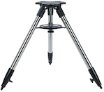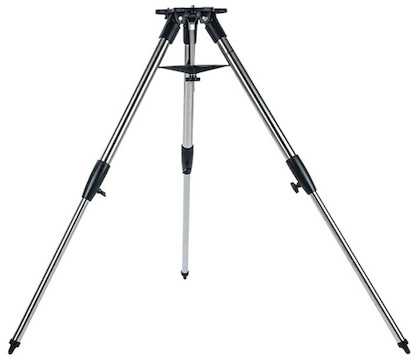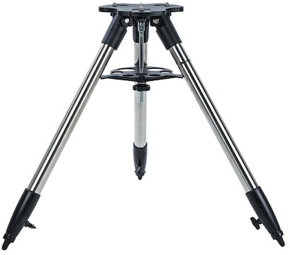 It adjusts from 24-41" in height and holds the telescope base securely with three captured screws. The 1.5" legs are made of stainless steel and consist of two sections, which lock in place with T-knob screws. The accessory tray holds multiple eyepieces, and also adds rigidity to the tripod as a center support. The tripod folds down to 28 × 9 × 9″ for transport and storage.