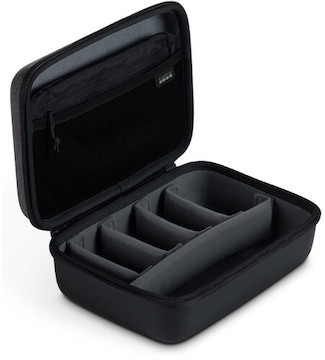 There’s an interior pocket where you can put an included zippered mesh pouch. The pouch lets you safely store easy-to-lose items such as memory cards and batteries. The compact case measures approximately 9 × 6″ and has a compression-molded design with padding and soft-tricot lining. The semi-rigid exterior is also weather resistant against light rain and snow. The Casey has a zippered closure, a soft grab/carry handle, and is small enough to keep inside most bags.