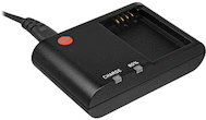 It runs on 100-240 VAC power, enabling you to charge your battery all over the world. Charging a dead battery to full capacity will take about 2 hr. The included power cable has a length of 3’.