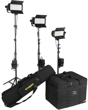 This used Lowel TotaLED Daylight LED 3-Light Kit that includes three TotaLED Daylight LED lights, three air-cushioned light stands, a large light kit bag, and a padded light stand case.