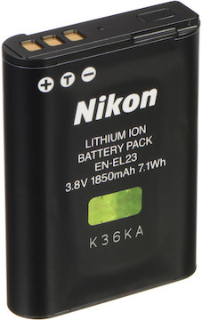 The used Nikon EN-EL23 is a 1850 mAh lithium-ion rechargeable battery used by the Nikon Coolpix P900.