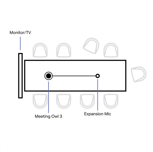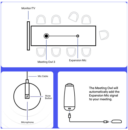 Expands the Owl 3’s Audio Pickup. The Owl Labs Expansion Mic for Meeting Owl 3 and 4+ is a puck-style tabletop mic that increases the audio pickup range of your Meeting Owl 3 and Meeting Owl 4 Plus from 18 feet to 26 feet.