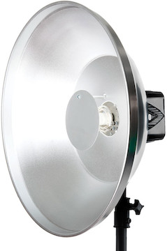 Popular for Fashion and Portraiture. The beauty dish is a popular tool for fashion photography, as it defines the subject with a very three-dimensional light. It’s most commonly used at close distances with the deflector attached, but it’s also quite effective at long distances with the deflector removed. The High Output Silver Beauty Dish provides a narrow 45° beam spread when used alone without the diffusion sock, but you can widen it to about 150° when the diffusion sock is mounted.