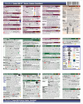 This used PhotoBert CheatSheet is an abbreviated, easy-to-read, color-coded guide to the controls and settings of the Canon EOS R Digital Mirrorless Camera.