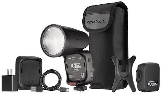 Battery & Additional Features. Fueled by rechargeable battery, this flash offers 20% longer lasting battery with a quick 2-hour charging time and 500+ full-power flashes per charge with fast recycle time of 0.05 to 1.5 seconds. The flash head is an 80Ws round head speedlight with a functional, easy-to-use 2.8" LCD color touchscreen display. The FJ80 II M Speedlight also offers a color temperature stability of 5500K across entire energy range and an energy-efficient LED modeling lamp with auto-adjust and independent output control. Additionally, this flash has a 360-degree horizontal range and 90-degree vertical pivot range. Transportation is flawless due to its compact & lightweight nature.