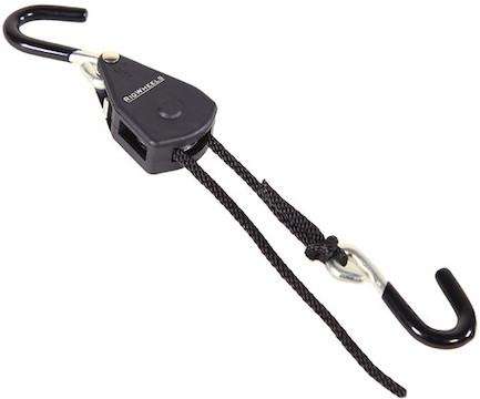 It features a weight range of up to 75 pounds, and the included nylon rope is approximately 6’ long and threads through a latching pulley arrangement. This allows you to add tension to your safety using only one hand as the pulley has an automatic latch system that prevents the rope from loosening. You actuate the latch to release the tension and allow the rope to loosen.