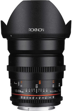 Wide-Angle Prime. The Rokinon 24mm T1.5 Cine DS offers full-frame coverage, giving you a budget-friendly wide-angle cine lens. Its fast T1.5 aperture allows depth-of-field control and low-light shooting flexibility.