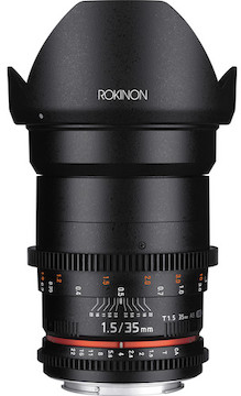 Wide-Angle Prime. The Rokinon 35mm T1.5 Cine DS offers full-frame coverage, giving you a budget-friendly wide-angle cine lens. Its fast T1.5 aperture allows depth-of-field control and low-light shooting flexibility.