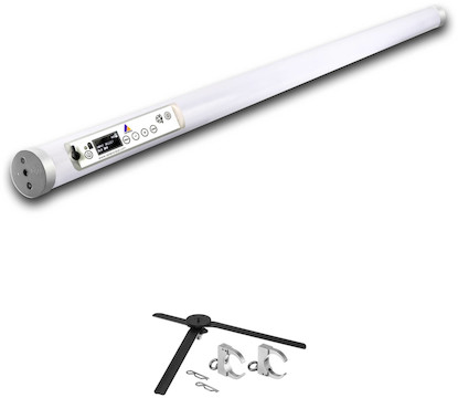 Suitable for cine, theatrical, and event productions, the wireless tube is powered by an integrated battery that will give you 20 hours of runtime on a three-hour charge. The light outputs up to 785 lux at 3.3’ (4000K) and features 16 LED emitters in a 3.4’ long tube that you can mount onto a set or on a stand, hang from a grid, or even hold in your bare hand. The Titan Tube has an impressive CRI/TLCI rating of 96/96, indicating high accuracy in the rendition of color. It uses RGB, mint, and amber LEDs as well as hue, saturation, and intensity control to access millions of custom colors.
