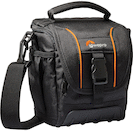 The used black Adventura SH 120 II Shoulder Bag from Lowepro is designed to hold and protect your small DSLR camera with attached lens from dust, dirt, and the elements.