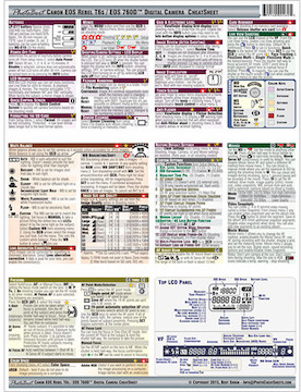 Quick and easy-to-reference, the used Cheat Sheet for Canon EOS Rebel T6s/760D DSLR Camera from PhotoBert is a handy, color-coded field guide to all of the controls, settings, features, and modes of your camera.