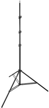 The stand will handle up to 8.5 lb and is topped with a 5/8" stud with 1/4"-20 threads. It has a wide footprint of 38" for greater stability. Air cushioning gently lowers the light when making height adjustments to protect equipment and fingers.
