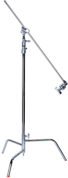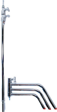 It includes a removable turtle base, a 2.5" swivel grip head, and a 40" Hollywood Arm that can hold a small light fixture, gobo, or flag. The unique staggered leg design of the C-Stand allows it to be nested and placed extremely close to one another on a set.