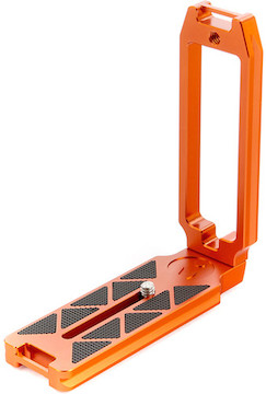 The used copper orange QR11-FBC Universal Full-Size L-Bracket from 3 Legged Thing is a two-piece Arca-type compatible dovetail mount that attaches to a full-sized DSLR that may have the optional battery grip as well.