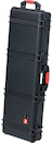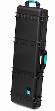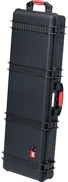 The case is black with a red handle and meets ATA 300 specifications for shipping cases. The hard-resin shell is virtually unbreakable, an interior rubber O-ring keeps the case air and watertight, and it has an air pressure release valve. The case is transported by a folding handle on the side or the top tow handle and built-in wheels.