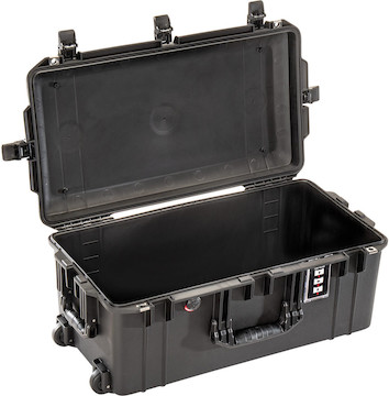 Store, transport, and protect your gear with the used black Pelican 1606 Wheeled Air Case without Foam.