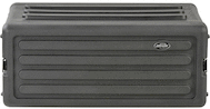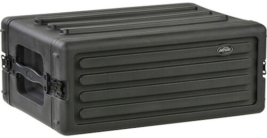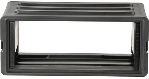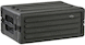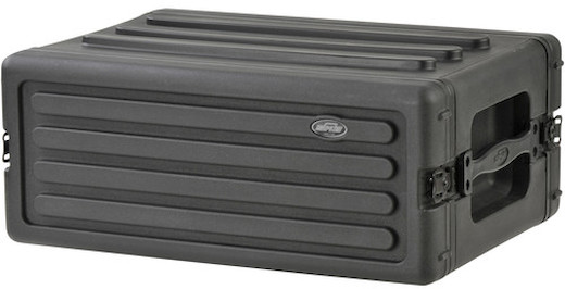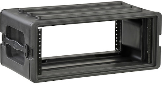 The used black 4U Roto Shallow Rack Case with Steel Rails from SKB is a rotationally-molded shallow rack case with multiple applications, including holding equipment such as computers or music players which are “rack-able”.