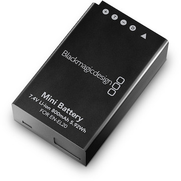 The used Blackmagic Design Pocket Cinema Camera Battery is an EN-EL20 type 7.4V, 800mAh lithium ion rechargeable battery.