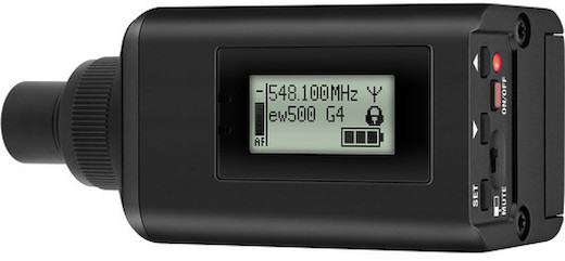 The plug-on transmitter features switchable 48V phantom power, 3520 frequencies that are tunable in 25 MHz steps, 20 fixed frequency banks, 32 compatible frequency presets, and 6 user banks with up to 32 user programmable frequencies. The transmitter’s menu-driven backlit display shows the current frequency, frequency bank and channel number, metering of AF level, lock status, transmission status, muting function, battery status, and more.