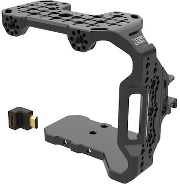 Accessories can be mounted around the cage using the 1/4"-20 and 3/8"-16 threads that feature ARRI-style anti-twist locating holes. There is also a shoe mount on top and two 3/8"-16 mounting threads on the front of the cage to add optional rod mounts, microphones, lights, or other accessories. Pass-through slots on the side allow you to manage your cables. An HDMI right-angle adapter and HDMI/USB cable clamp are included to protect the camera’s cable ports from cable pulls and snags.