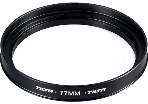 This Tilta 77mm Adapter Ring allows you to mount the Tilta Mini Clamp-On Matte Box on lenses that have a 77mm front diameter. The adapter ring screws onto the front of the lens, and the matte box then clamps onto the adapter ring. The thumbscrew on the side of the matte box is used to secure the matte box firmly to the adapter ring. The adapter ring also provides a thread for attaching 77mm screw-on filters to the lens. This is done right before mounting the matte box. After attaching the adapter ring to the lens, screw on the filter to the provided thread, and then attach the matte box. The adapter ring is made of aluminum and comes in black.
