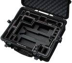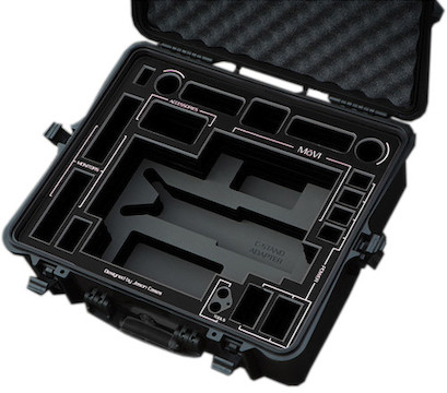 The case holds your collapsed MoVI M5 and accessories. The hard-resin case is virtually unbreakable, and the interior rubber O-rings keep the case both air and water-tight. It comes with a comfortable soft-grip handle for carrying, and an air pressure release valve.