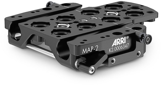 The used MAP-2 Adapter Plate for ALEXA Mini from ARRI supports a pair of 15mm LWS rods, and mounts to the bottom or top of the camera.