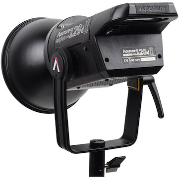 Boasting 25% more brightness than its predecessor, DMX control, and a redesigned handbrake-locking yoke, the used Light Storm LS C120D II Daylight LED Light from Aputure is a chip-on-board (COB) fixture with a 5500K color temperature.