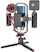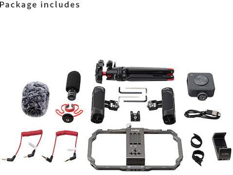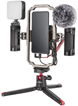 The full-featured kit includes a smartphone cage, a desktop tripod, a power bank holder, two side handles, a shoe mount, an LED light, a microphone, a microphone shock mount, furry and foam microphone windshields, a camera cable, a smartphone cable, a charging cable, a case, and assembly hardware.
