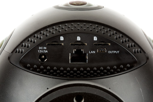 Live Stitching, Image Stabilization, & On-Board Mics. The unit’s internal processor is capable of real-time video stitching of 4K video, and the Insta 360 II has improved image stabilization. Audio is recorded with four on-board microphones capable of producing ambisonics audio. With so much packed into one small sphere, the fans work hard to keep everything cool. Fan noise can become audible in warm shooting locations, so we recommend capturing critical audio externally or using the 1/8" input jack to get your mic further away from fan noise.