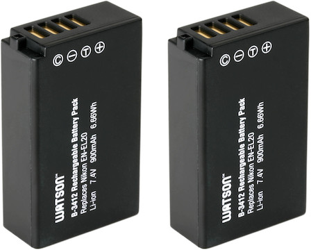 The Watson EN-EL20 is a replacement battery pack that works with the same cameras as the Nikon EN-EL20. It has a 900 mAh capacity, 7.4V of output power, and 6.66 Wh.