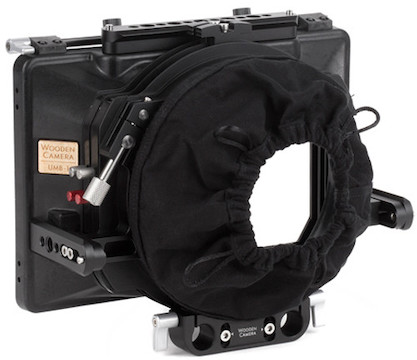 The used Wooden Camera UMB-1 Universal Matte Box (Base) mounts to 15mm LWS rods using a height-adjustable bracket and features two rotating 4 × 5.65″ filter stages, with an optional third stage available as an add-on.